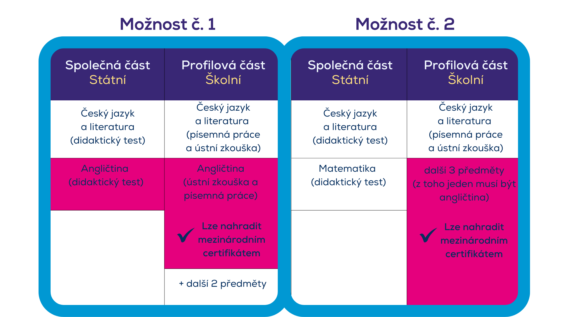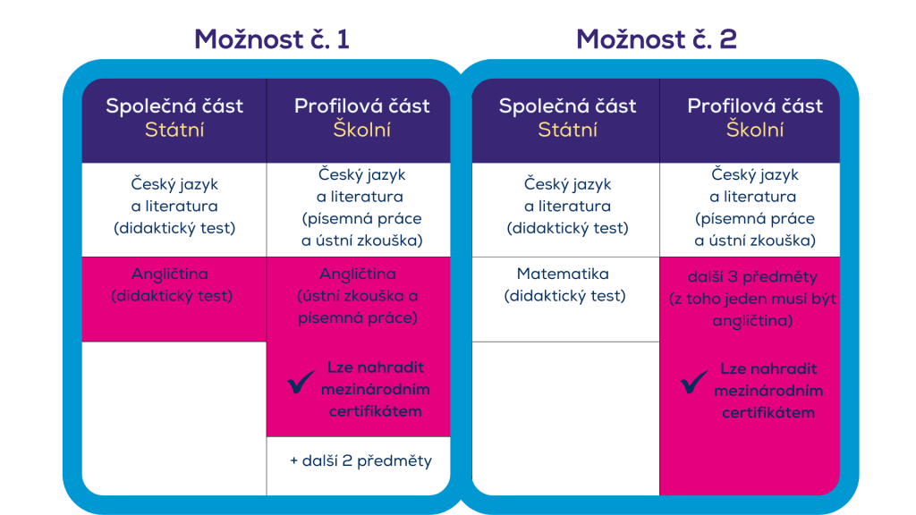 Od školního roku 2020/2021 nabízí Ministerstvo školství možnost nahradit školní část maturitní zkoušky z cizího jazyka mezinárodně uznávanou jazykovou zkouškou na úrovni minimálně B1. V praxi to znamená, že student absolvuje pouze didaktický test ve státní části maturity a školní část nahradí certifikátem z jazykové zkoušky.